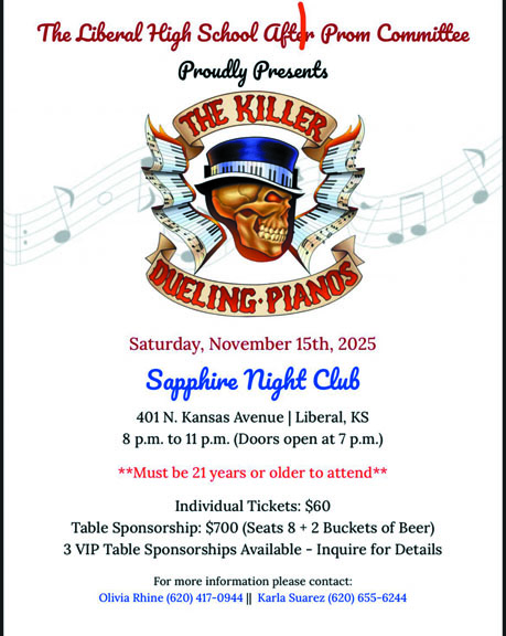 The Killer Dueling Pianos will be performing from 8 to 11 p.m. Saturday, Nov. 15 at Sapphire Night Club at 401 N. Kansas Ave. as a fundraiser for the Liberal High School After Prom Committee. Individual tickets are $60, and table sponsorships (which includes eight seats and two buckets of beer) are $700, and attendees must be 21 or older to get in the door. That night will feature Jami McNeill and Ashley Owen on the pianos.