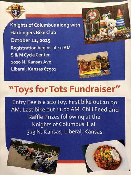 To help with that, the Harbingers Motorcycle Club and the local Knights of Columbus chapter are teaming up for a Toys For Tots Fundraiser that will be taking place Saturday, Oct. 11. Registration will start at 10 a.m. at S&M Cycle Center at 1020 N. Kansas Ave., and the entry fee is a $20 toy. The first motorcycles will go out at 10:30 a.m. and the last ones will go out at 11 a.m., with a chili feed and raffle drawing taking place after the run at the Knights of Columbus hall at 323 N. Kansas Ave.