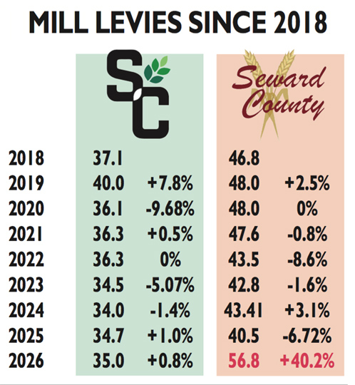 This chart shows how the college and the county were in alignment with very close comparisons until the proposed 2026 tax increase of 13.4 mills by Seward County in the exact same geographical area as SCCC.