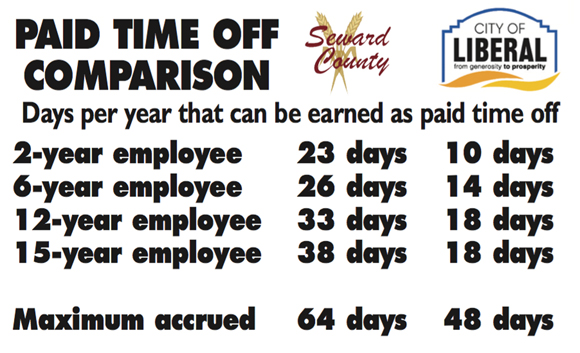 For a two-year employee, Seward County provides 230 percent more paid time off, providing 23 days off to the more standard 10 days at the City of Liberal.