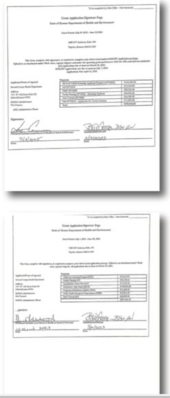 Signatures appearing to be those of Seward County Chair Scott Carr appears on grant applications dated Aug. 14, 2023, March 22, 2024 and March 3, 2025 along with a document signed by what appears to be Tammy Sutherland-Abbott’s signature March 10, 2023, were obtained by Open Record Requests by local citizen Carolyn Huddleston while researching the grants that have been awarded to Seward County.