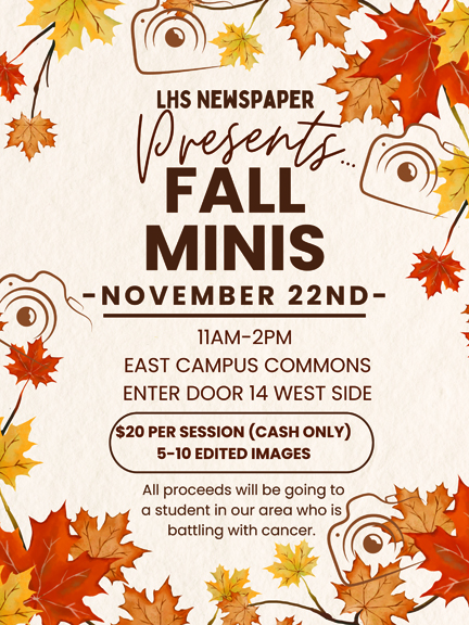 The Liberal High School Angry Red News staff will be hosting a fall minis photography sessions fundraiser from 11 a.m. to 2 p.m. Saturday in the LHS East Campus commons area. Cost is $20 (cash only) per session, which includes five to 10 edited images, and all proceeds will be going to an LHS student currently battling cancer. The fundraiser is open to the entire community.