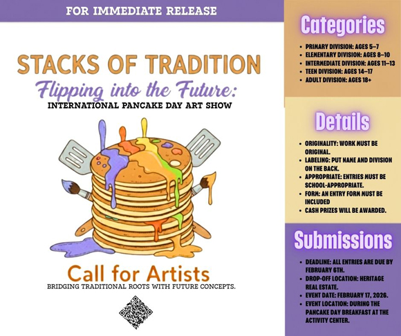 Local creators are invited to participate in the upcoming International Pancake Day Art Show, a featured event of the 2026 Pancake Day festivities. This year’s theme, “Stacks of Tradition, Flipping into the Future,” encourages artists to celebrate the rich history of the event while imagining what lies ahead.
