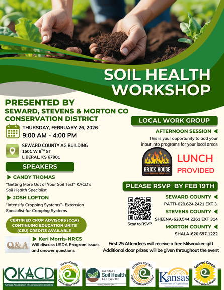 To RSVP for the Soil Health Workshop, call Amerin at 620-624-2421, Ext. 3, Shuck at 620-544-2261, Ext. 314 or Larue at 620-697-1222. To RSVP for the LWG or to request more information about it, contact the Seward County Conservation District or NRCS staff by calling 620-624-241, Extension 0770. Those planning to attend are asked to RSVP by Feb. 19.