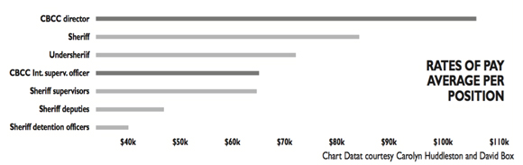 And how about her supervision officers? Is $31.77 in line with that of the rank and file deputies, whose average pay is $22.33? Or what about the detention officers, which I believe should be their true reference group, where the mid-point of the distribution was $18.79, and the average was $19.46 per hour? It’s clear the sheriff’s department is underfunded, but still there’s a serious problem here.
