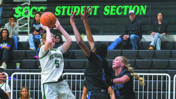 The Lady Saints struggled offensively in the first half, shooting just 20.7 percent from the field (6-of-29). Barton built its largest lead late in the second quarter, going up 27-16, but Seward closed the half with the final two baskets — a jumper and two free throws from freshman Au'Rayona Seals — to cut the deficit to 27-20 at the break.
